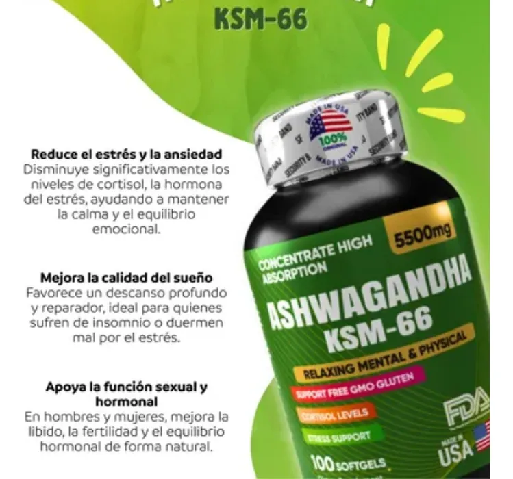 Ashwagandha KSM 66 Reducción de Estrés y Energía Natural Ashwagandha KSM 66 es un suplemento de alta calidad diseñado para reducir el estres mejorar la función cognitiva y aumentar la resistencia física Utilizando el extracto concentrado de raíz de ashwagandha este suplemento natural ayuda a restaurar el equilibrio hormonal y a mejorar el bienestar general siendo un excelente aliado para quienes buscan reducir el agotamiento y mejorar su desempeño diario Cantidad y concentración 100 capsulas de 5500 mg de KSM 66 Ashwagandha Beneficios clave Disminuye los niveles de cortisol mejorando el estado de ánimo Apoya la memoria concentración n y claridad mental Aumenta la masa muscular y la fuerza f sica Reduce la inflamación y el dolor articular Fortalece el sistema inmunológico ayudando a combatir infecciones Características del producto KSM 66 Ashwagandha extracto de ra z de alta concentración Apoyo al equilibrio hormonal especialmente en situaciones de estrés Suplemento natural y efectivo para una vida m s activa y saludable Apto para veganos y sin aditivos artificiales Modo de consumo Tomar 1 capsula por la mañana y 1 capsula por la tarde con agua Recupera tu energía mejora tu estado de ánimo y mantén el estrés bajo control con Ashwagandha KSM 66